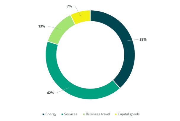 - Achats de bien et services : 2471gCO2e (42%). Principalement liés à l’achat de service telle que des formations, assurances et services bancaires (Incertitudes de 80% dû à l’utilisation de facteurs monétaires). Pour les achats de biens il s’agit de consommables de bureau.